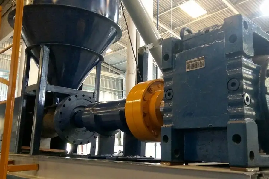 Extrusora Superior (1) com rosca de 135mm, 4 metros de comprimento (L/D 30), caixa redutora reforçada, rosca transportadora do aglutinador para o funil, escada de verificação do funil com proteção, funil e base de aço sólida.